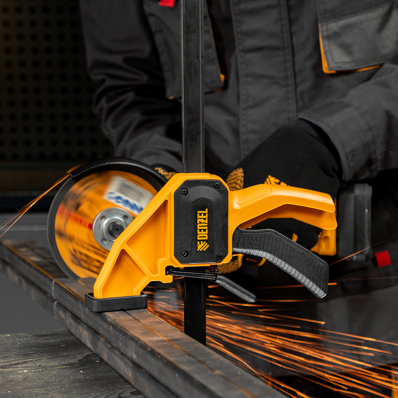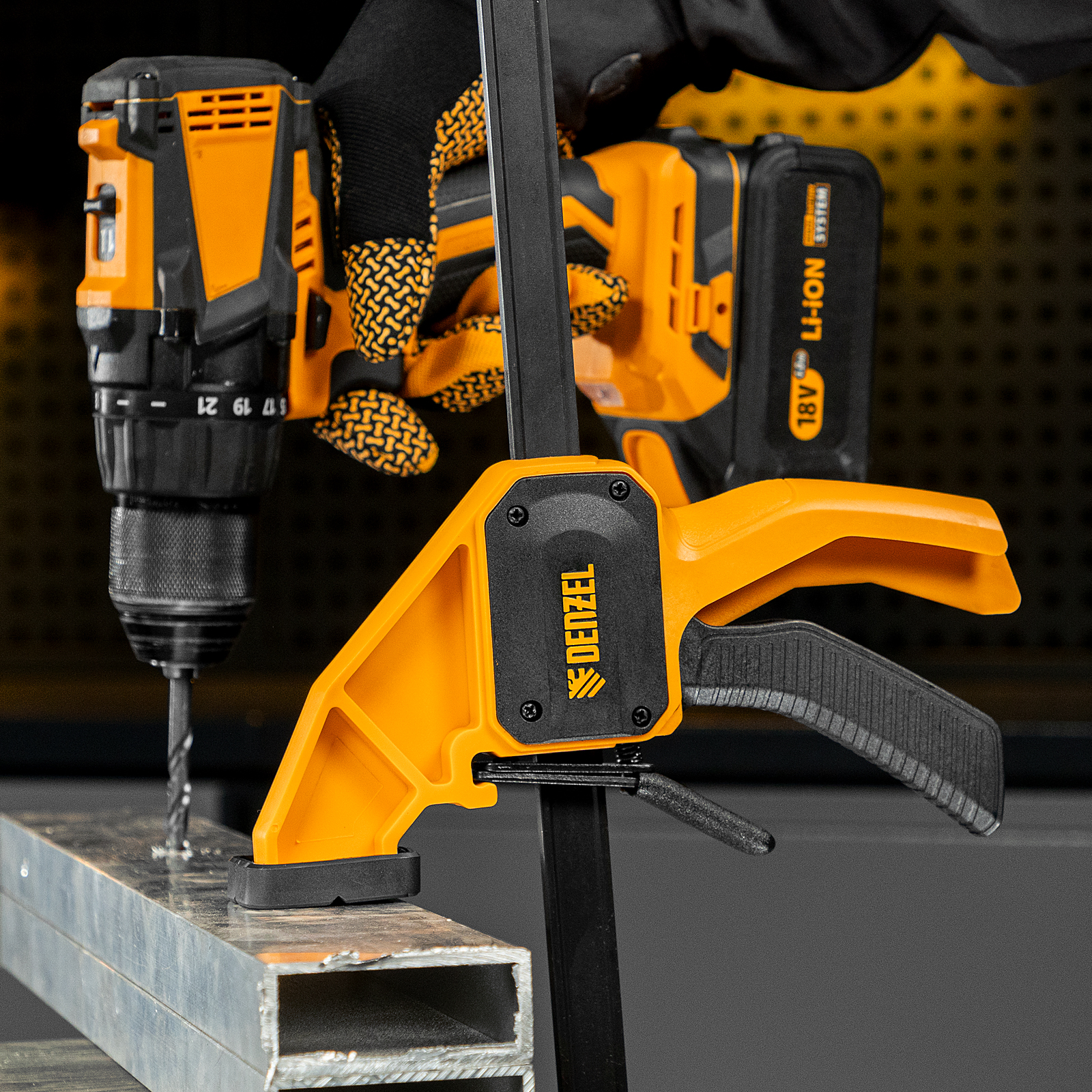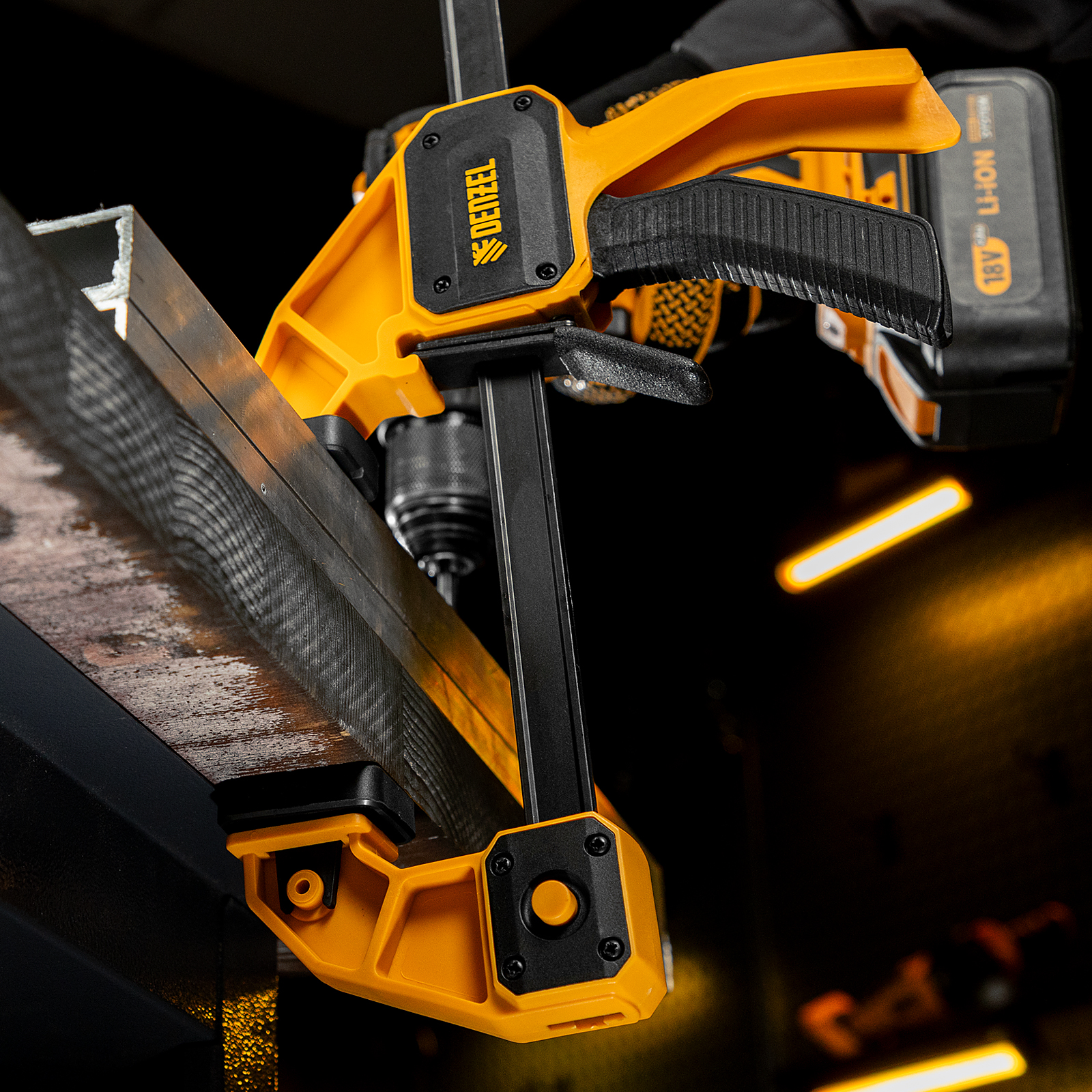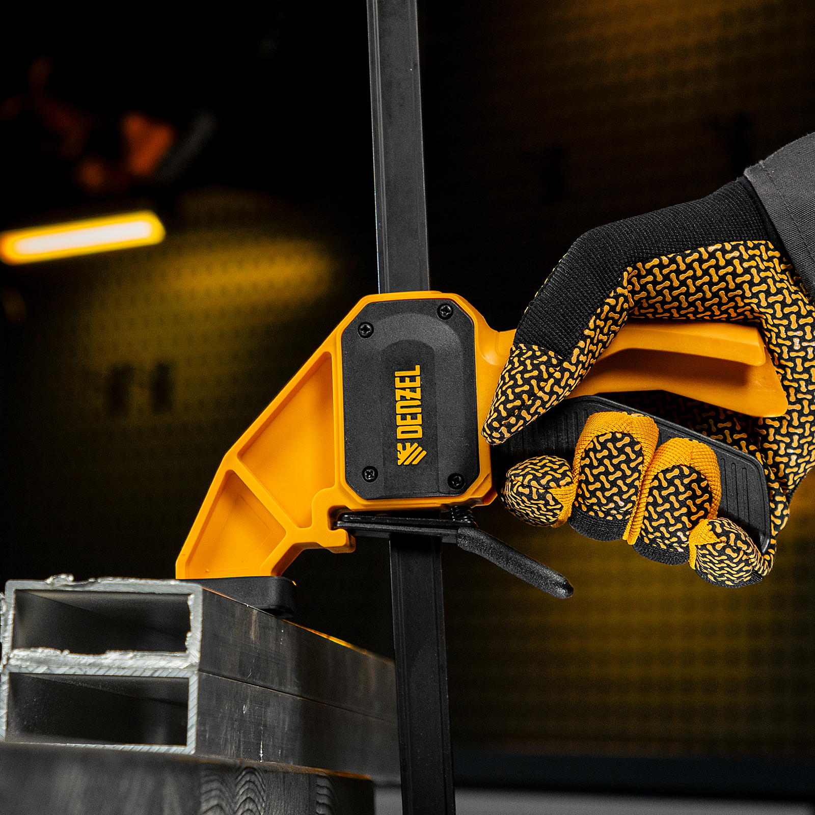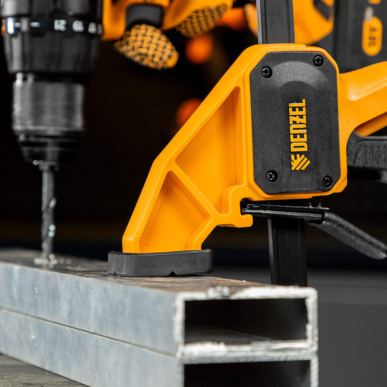 - Комфортное использование — струбцина весит всего 620 г, обрезиненная кнопка фиксации обеспечивает удобный захват.