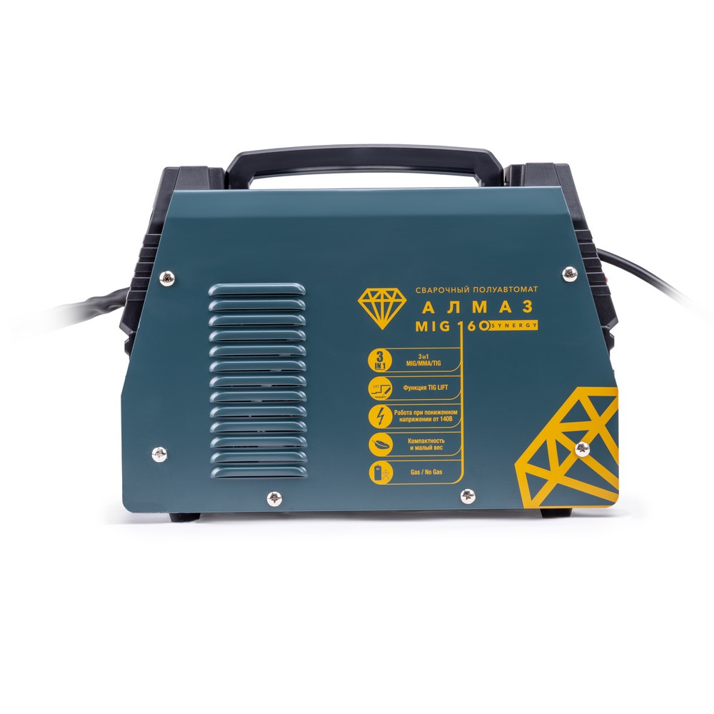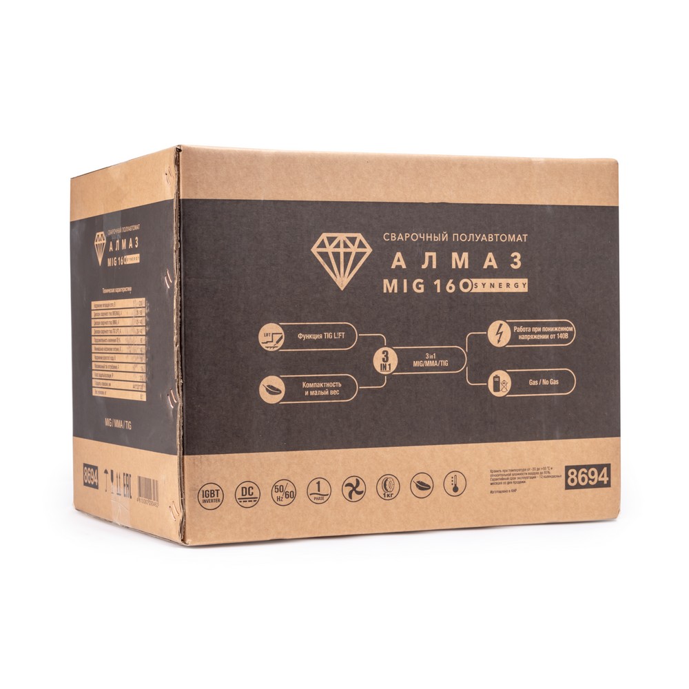 Сварочный полуавтомат FOXWELD АЛМАЗ MIG 160 SYNERGY позволяет производить сварку, используя инверторную технологию преобразования и управления сварочным током. При этом аппарат обеспечивает идеальные параметры сварки даже при падении входящего напряжения, особенно на малых токах при сварке небольших толщин. Аппарат позволяет проводить следующие виды работ: полуавтоматическую сварку (MIG/MAG) сплошной проволокой в среде защитного газа. полуавтоматическую сварку (FLUX WIRE) самозащитной проволокой без использования защитного газа, ручную дуговую сварку (ММА) на постоянном токе штучным электродом с рутиловым и основным покрытием, аргонодуговую сварку (TIG LIFT) на постоянном токе с возбуждением дуги касанием вольфрамового электрода. Алмаз MIG 160 SYNERGY имеет синергетическую систему управления в режиме полуавтоматической сварки, что дает возможность модифицировать сварочные параметры, с помощью регулировки единственного параметра. Аппарат применяется для использования в быту, на даче, в производстве стальных конструкций, при выполнении кузовного ремонта автомобилей и т.п.СИНЕРГЕТИЧЕСКИЙ РЕЖИМ УПРАВЛЕНИЯ: Режим синергетики позволяет сэкономить время и получить качественное сварное соединение даже новичку, так как основные параметры подбираются автоматически с возможностью тонкой ручной подстройки сварочного процесса. Синергетику можно отключить для работы в ручном режиме.МНОГОФУНКЦИОНАЛЬНОСТЬ 3-В-1: Благодаря своей многофункциональности, аппарат позволяет проводить следующие виды работ: полуавтоматическую сварку (MIG/MAG) сплошной проволокой в среде защитного газа. полуавтоматическую сварку (FLUX WIRE) самозащитной проволокой без использования защитного газа, ручную дуговую сварку (ММА) на постоянном токе штучным электродом с рутиловым и основным покрытием, аргонодуговую сварку (TIG LIFT) на постоянном токе с возбуждением дуги касанием вольфрамового электрода.РАБОТА ПРИ ПОНИЖЕННОМ НАПРЯЖЕНИИ: Аппарат работает от однофазной сети 220 В при перепадах напряжения от 140 до 240 В. Это даёт возможность производить сварочные работы в «плохих» сетях – на даче, в домашних условиях при пониженном или нестабильном напряжении.ПРЕИМУЩЕСТВА:Работа при пониженном напряжении от 140 ВАргонодуговая сварка (TIG LIFT) на постоянном токеПростая синергетика, подстраивает режим под диаметр проволокиРучная дуговая сварка штучным покрытым электродом (ММА) на постоянном токеВстроенная термальная защита, индикатор перегреваИндикатор сетиВстроенная горелкаПереключатель диаметра проволокиВес бухты проволоки - до 1 кгБыстрая смена полярностиБайонетный разъем 10 – 25 мм²Компактность и малый весИнверторная технология на базе новейших IGBT транзисторовФУНКЦИОНАЛЬНЫЕ ОСОБЕННОСТИ:ИНВЕРТОР НА ТРАНЗИСТОРАХ IGBT: Сварочные аппараты с технологией IGBT (Insulated Gate Bipolar Transistor) имеют следующие преимущества: высокое номинальное напряжение, небольшую мощность управления и высокую скорость переключения.РЕЖИМ TIG LIFT: Аргонодуговая сварка вольфрамовым электродом при помощи TIG горелки подходит для работы в условиях повышенной влажности.НЕБОЛЬШОЙ ВЕС: Небольшой вес и размеры сварочного аппарата плюс ручка на корпусе добавляют мобильности, компактности и идеально подходят для бытового и полупрофессионального использования.ЗАЩИТА ОТ ПЕРЕГРЕВА: Если аппарат работает непрерывно долгое вре