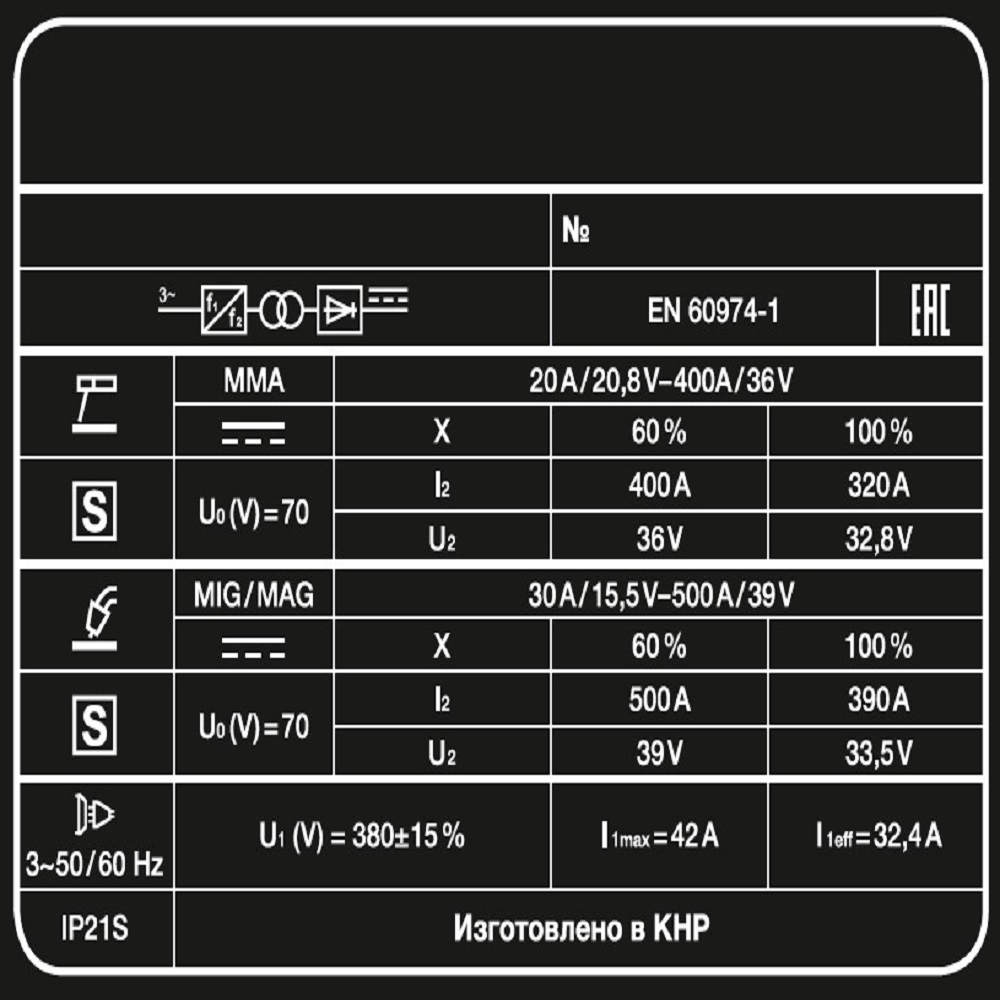 Диапазон сварочного тока (MIG/MAG), A