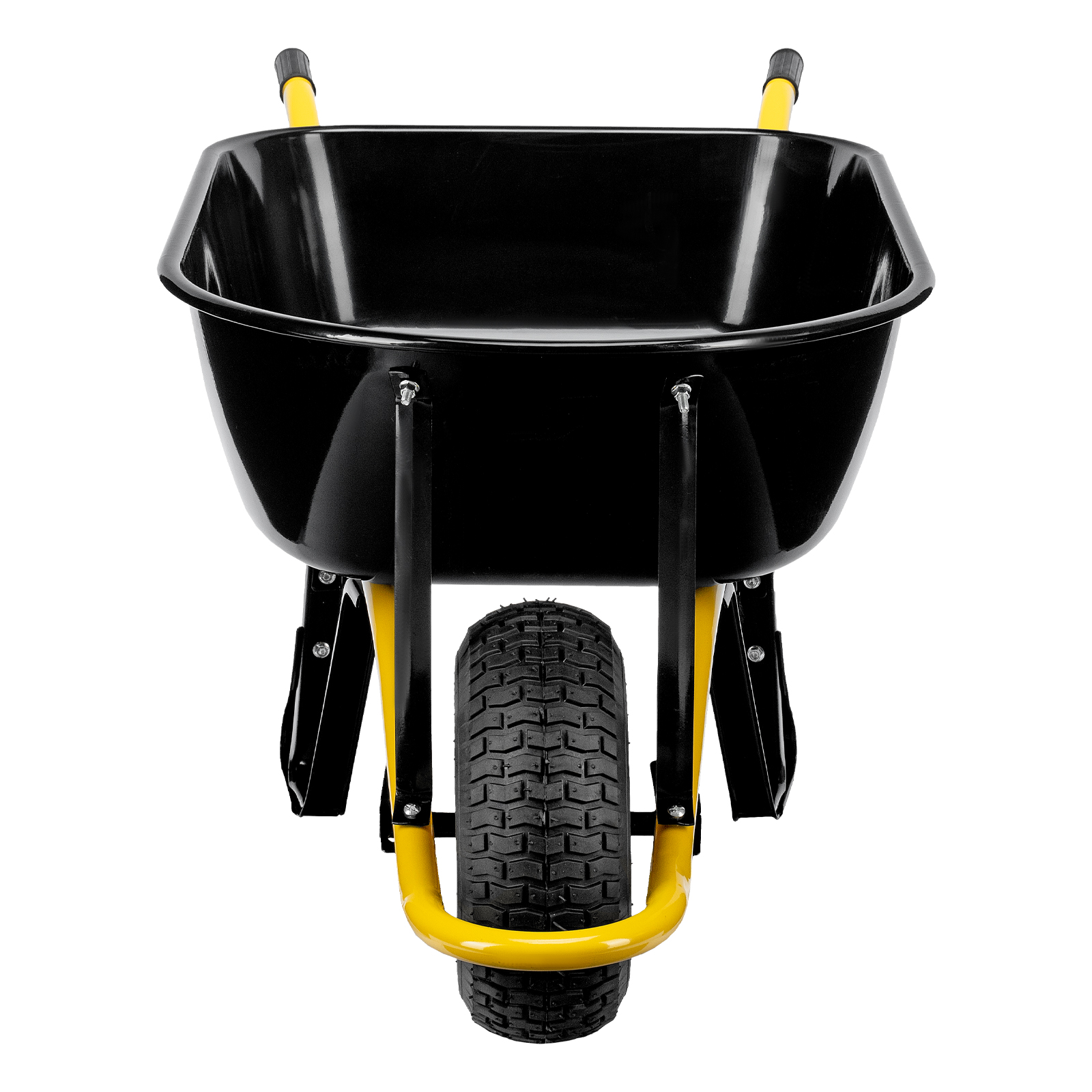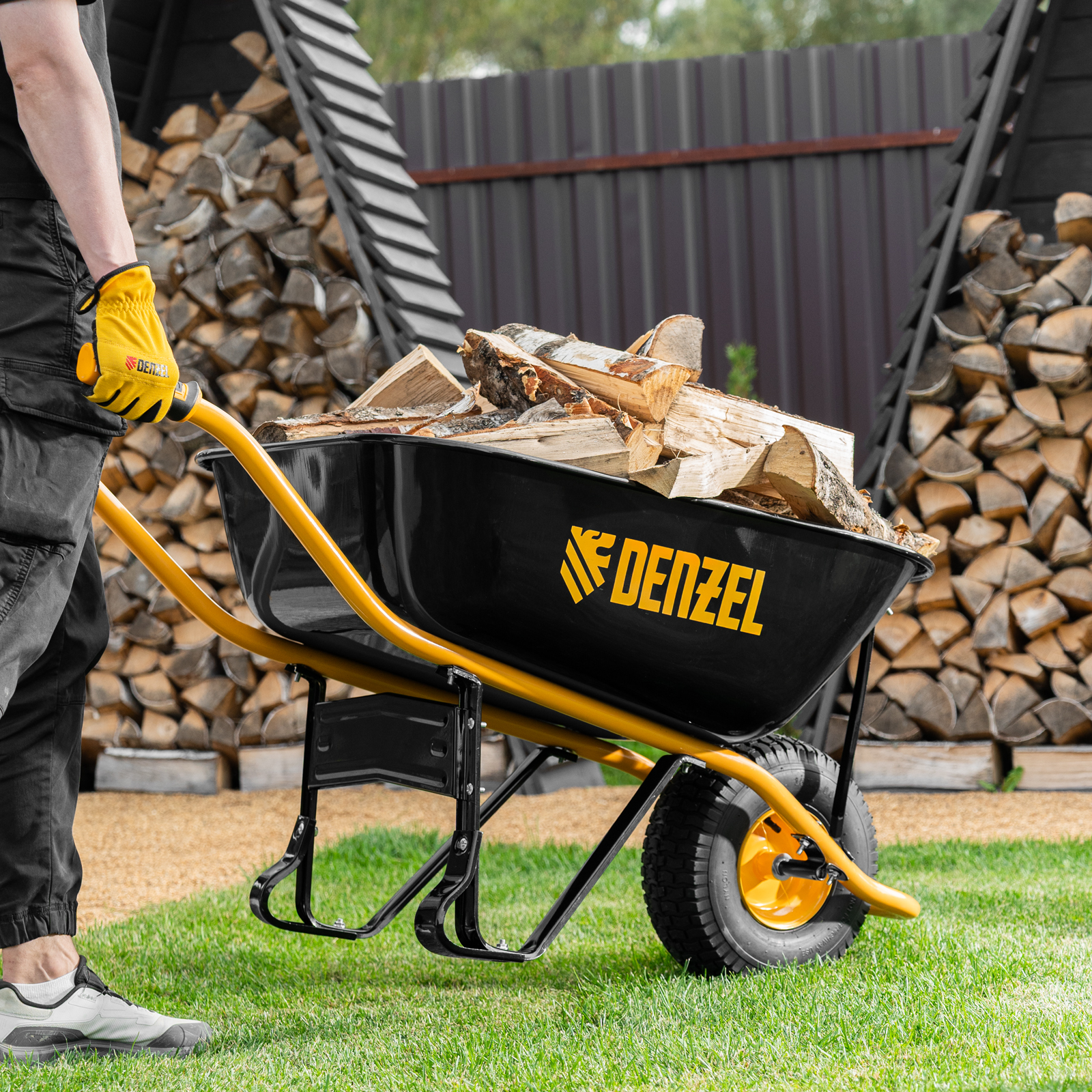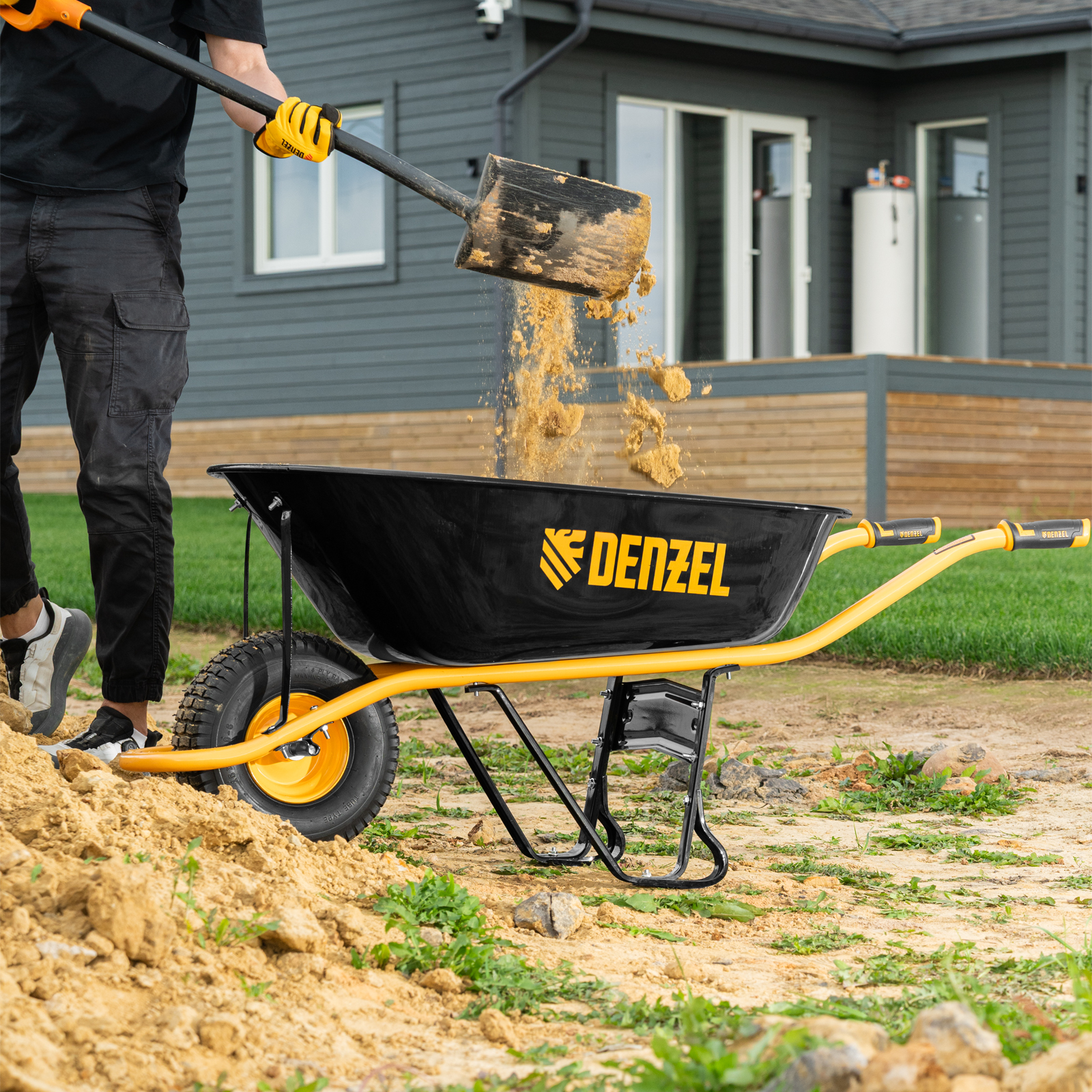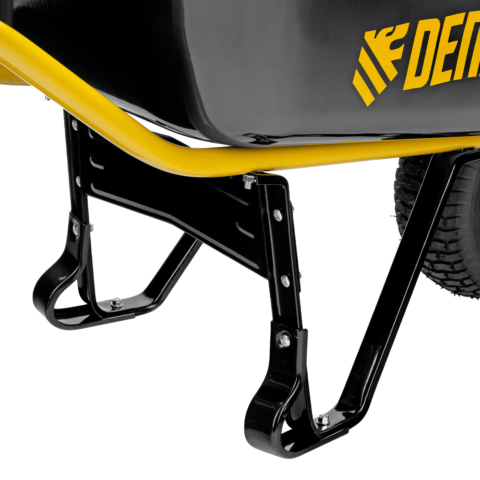 • Устойчивость — тачка не проваливается в грунт благодаря широкому пневматическому колесу и подпятникам на ножках.