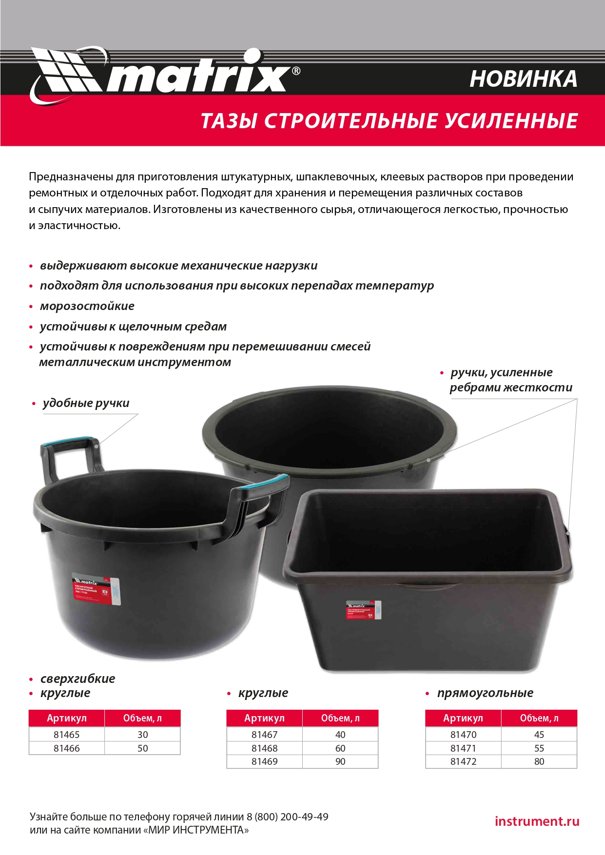 Таз круглый строительный усиленный Matrix 81469 объемом 90 л предназначен для замешивания строительных растворов любого типа при проведении ремонтно-отделочных работ. Благодаря диаметру 662 мм для приготовления смеси удобно использовать различный отделочный инструмент (шпатели, кисти). Пригодится такой таз и в быту: он удобен для хранения сыпучих материалов, сбора и утилизации мусора, проведения влажной уборки.