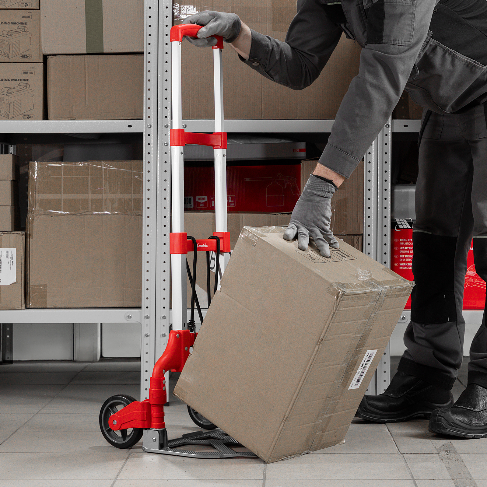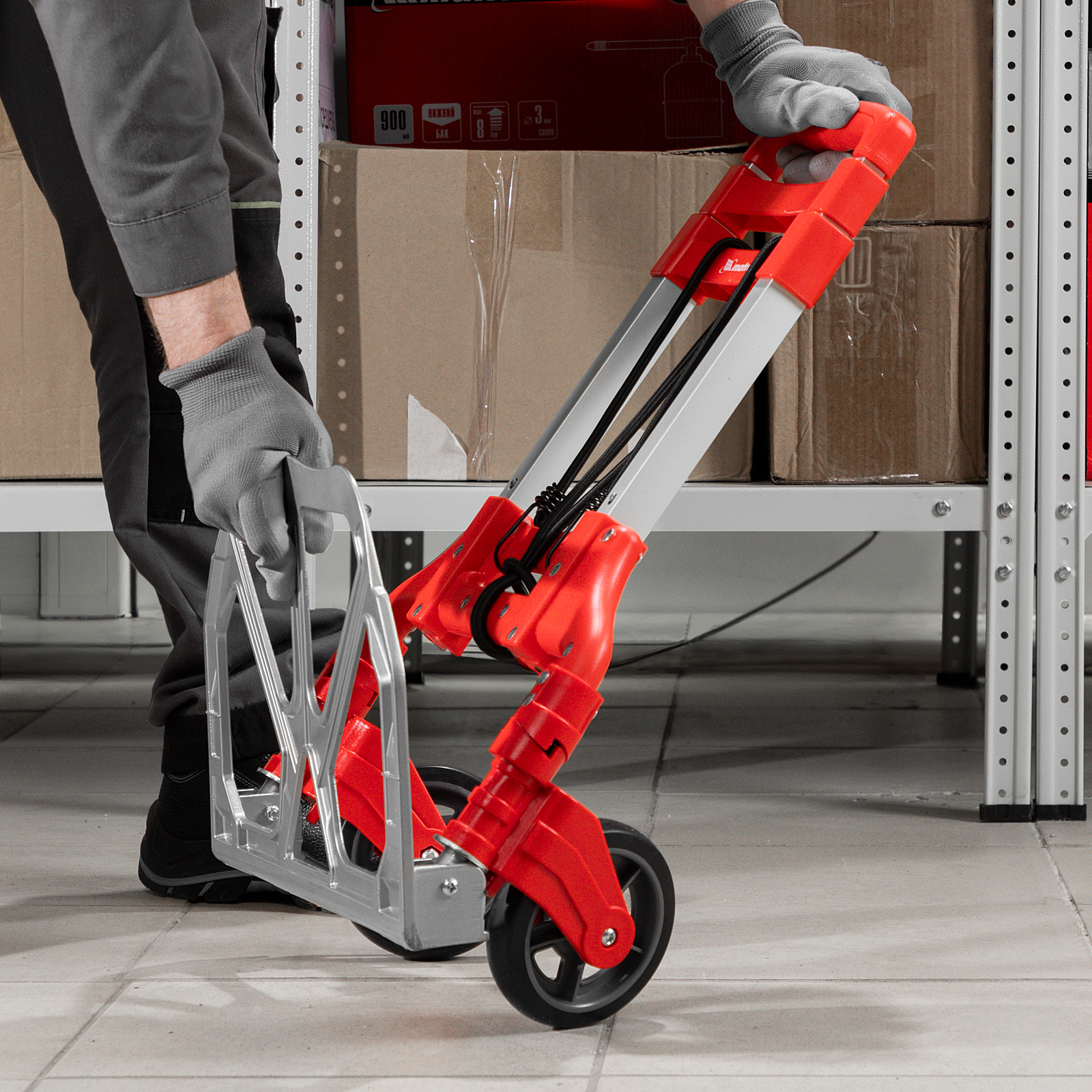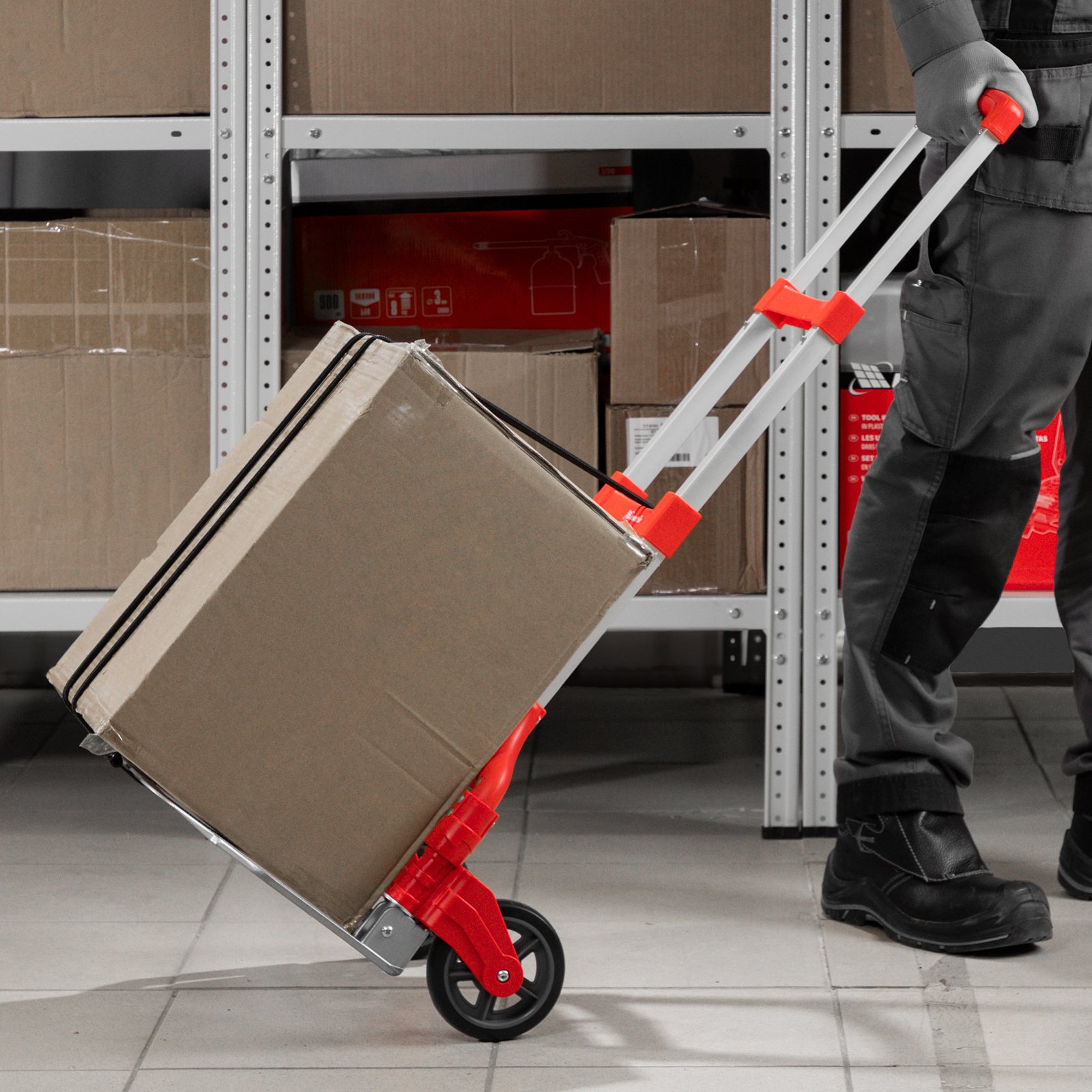 • Удобное хранение и транспортировка — платформа и колеса складываются, поэтому тележка не занимает много места.