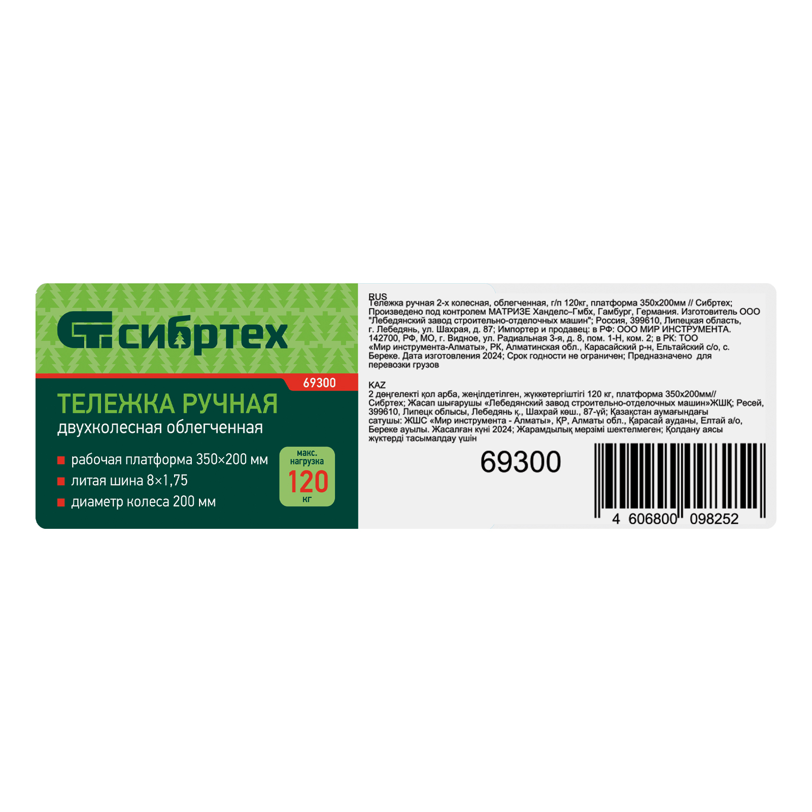 Тележка ручная 2-х колесная, облегченная, г/п 120кг, платформа 350х200мм Сибртех в Москве