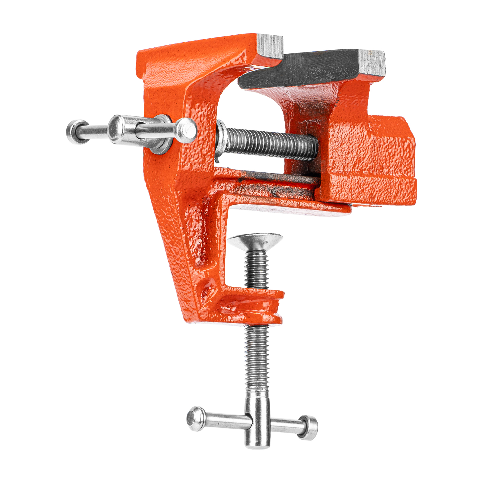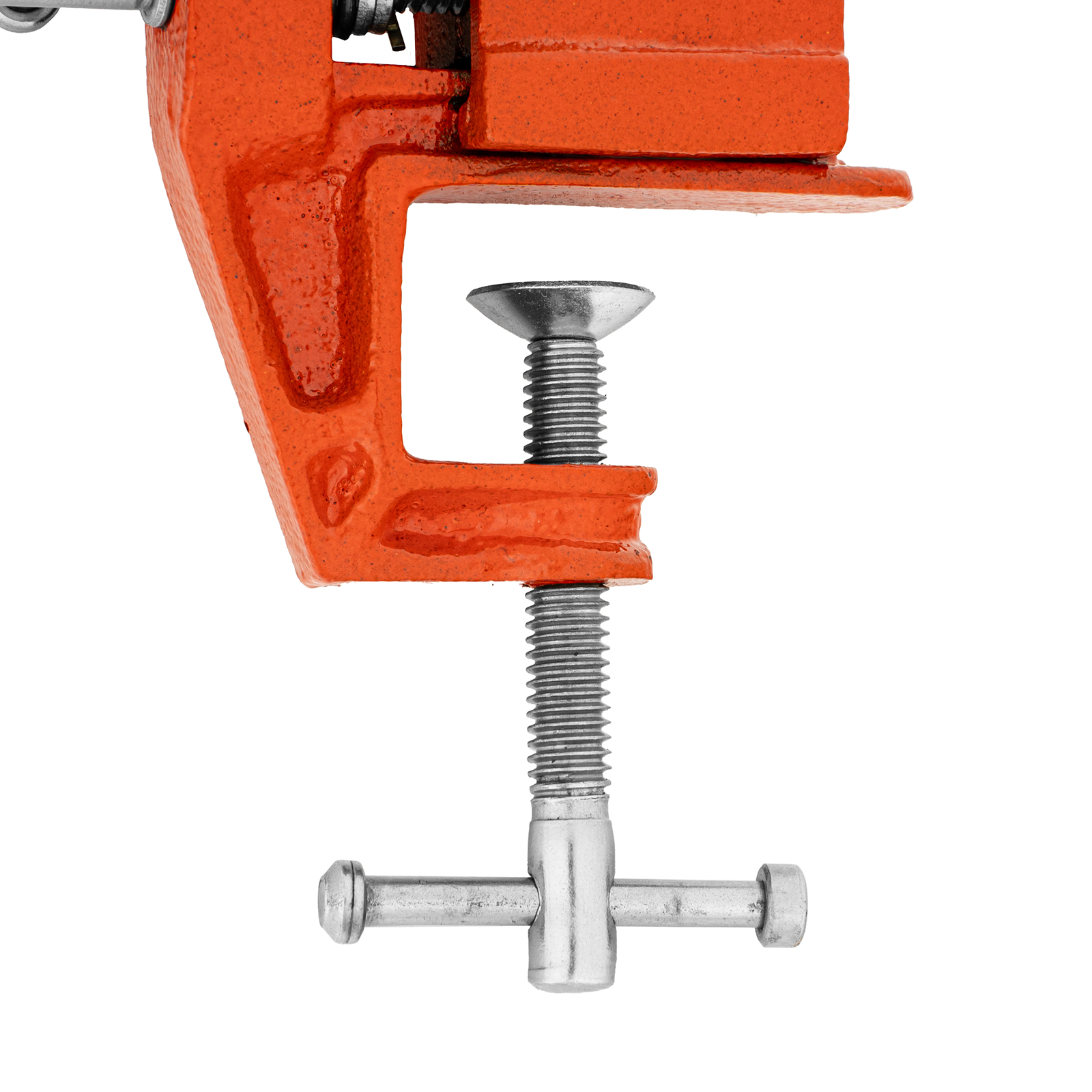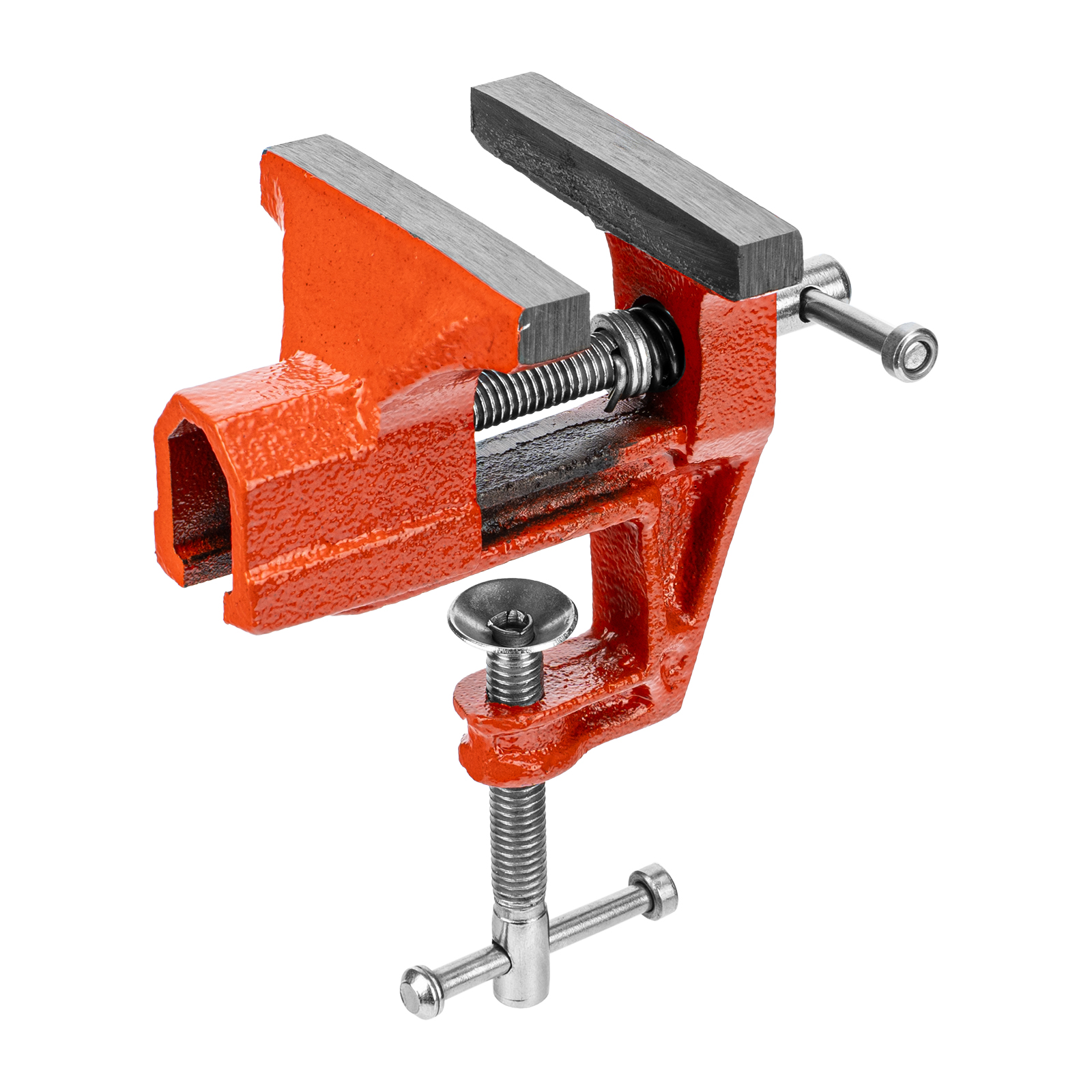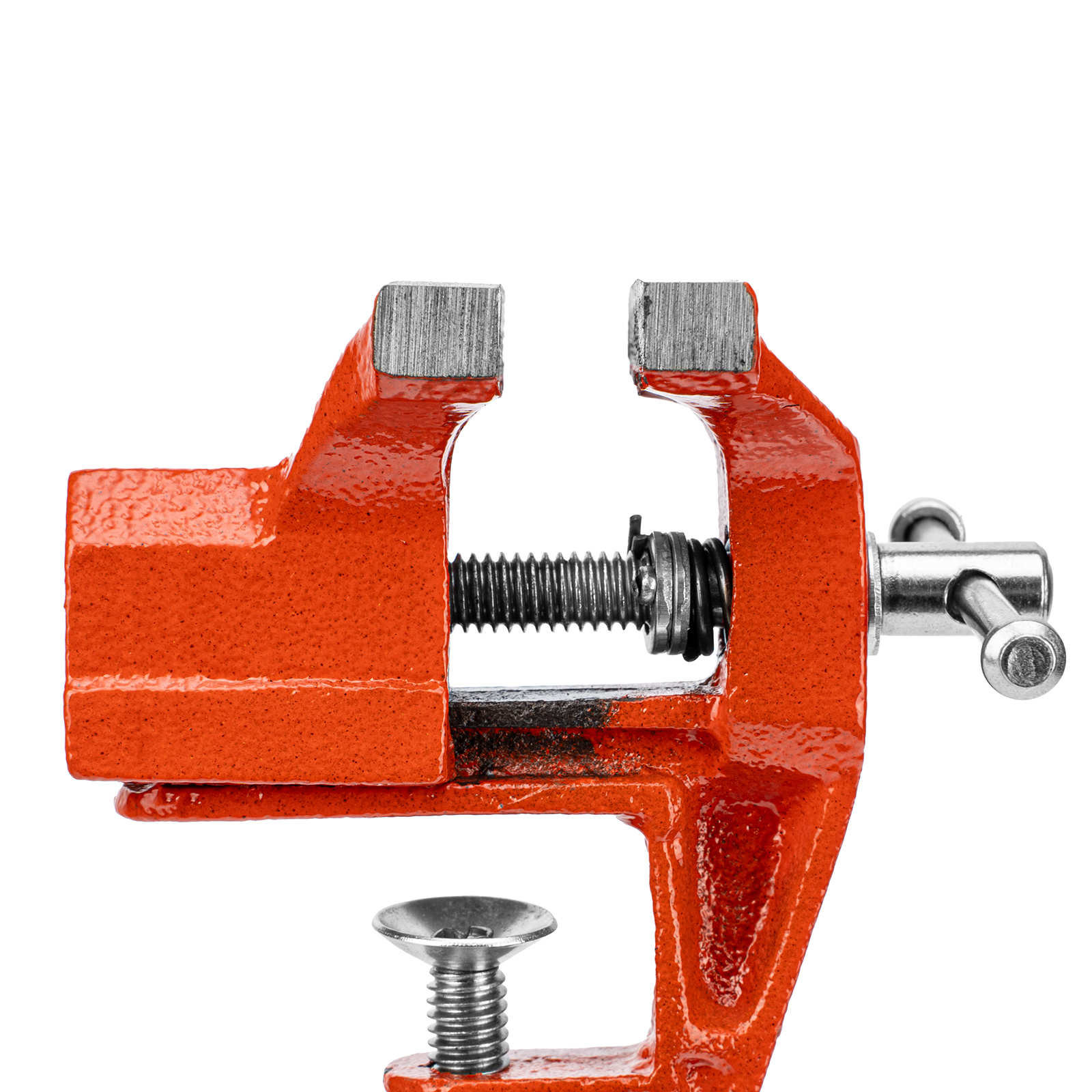 - Простое использование — винтовой зажимной механизм позволяет легко устанавливать и снимать тиски с рабочего стола.