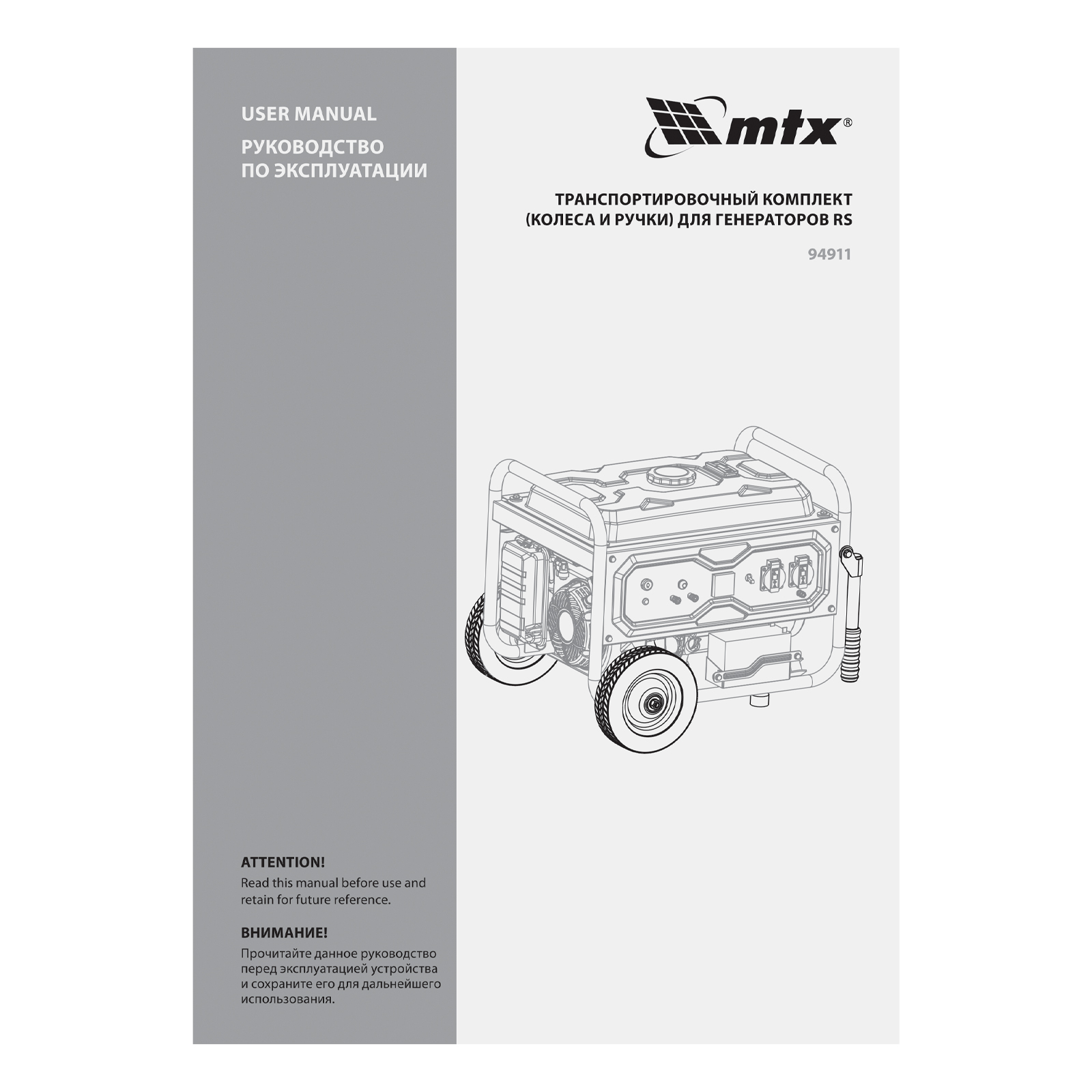 Транспортировочный комплект MTX 94911 предназначен для перемещения генераторов серии RS при помощи колес и рукояток. Совместим с моделями RS-3000, RS-4000, RS-4000E, RS-7000, RS-9000, RS-9000E (артикулы 946105, 946115, 946125, 946135, 946155, 946165).