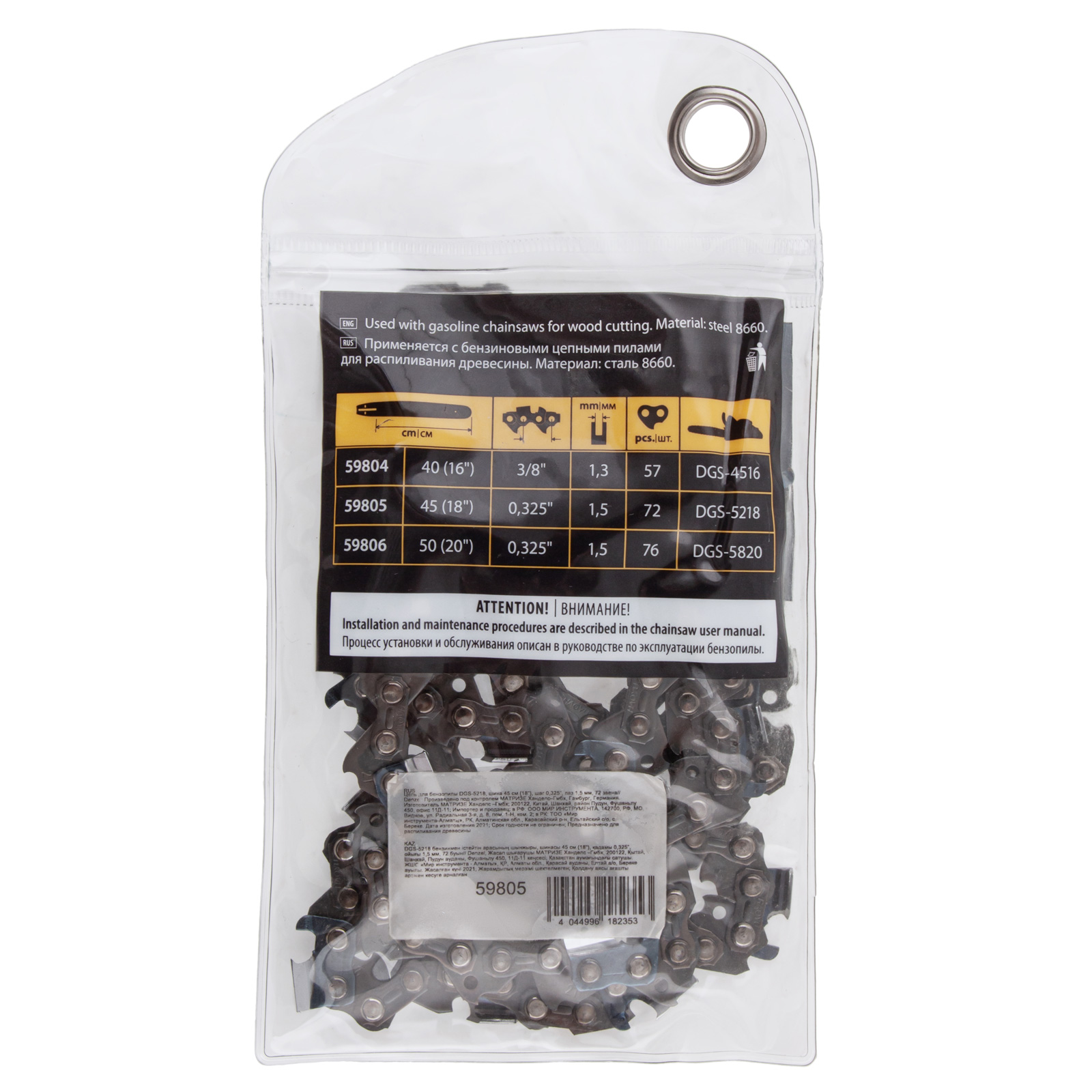 Цепь Denzel 59805 с шириной паза 1,5 мм используется с бензопилой Denzel DGS-5218, состоит из 72 звеньев с шагом 0,325″ и надевается на пильную шину длиной 45 см (18″). Оптимальна для проведения ремонтных и строительных работ, распиловки бревен, срезания сучьев и веток в саду.