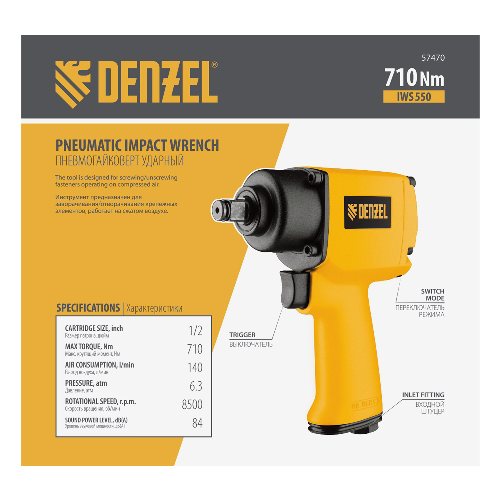 Ударный пневмогайковерт IWS550 Compact, 1/2", 8500 об/мин, 710 Нм Denzel в Москве