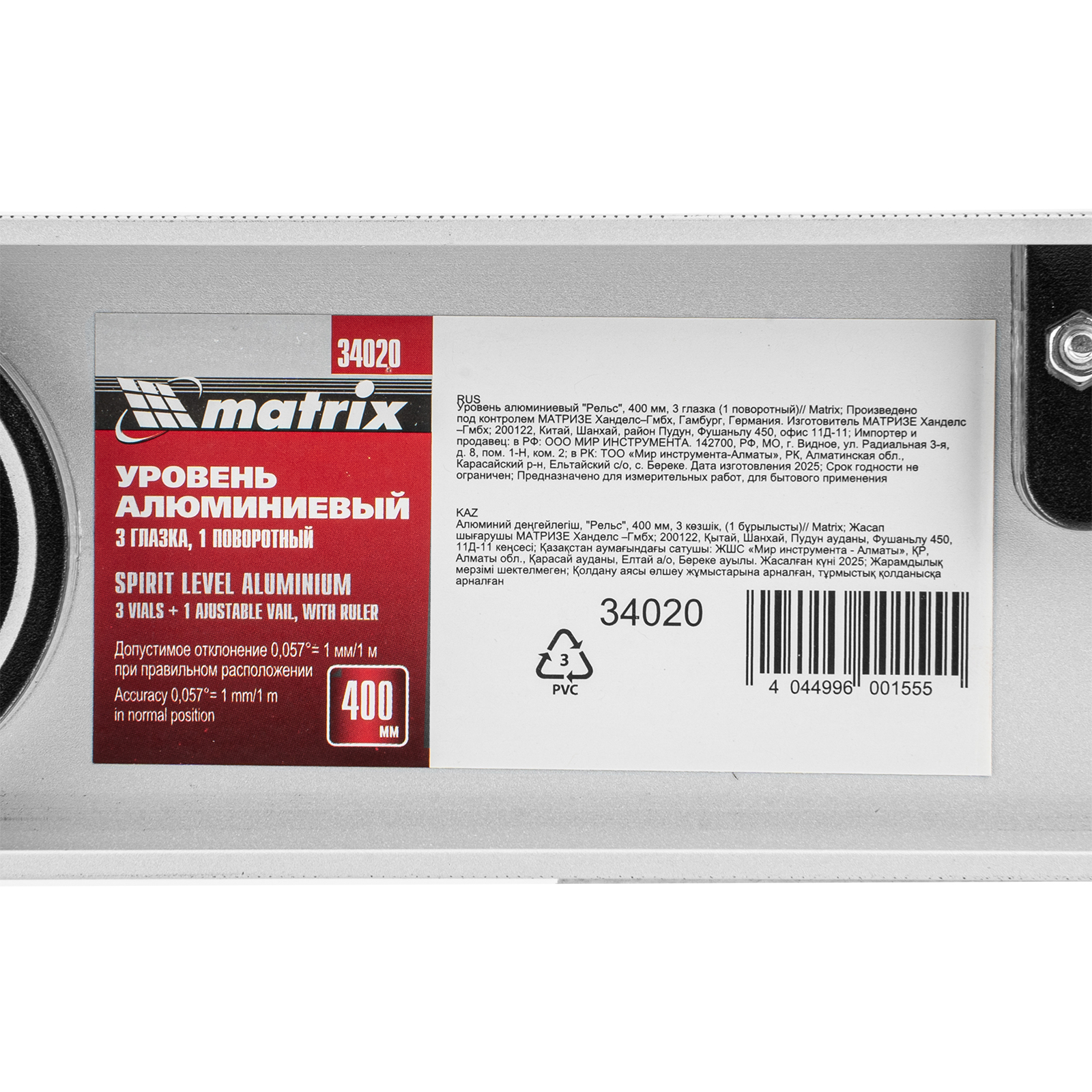 Уровень алюминиевый "Рельс", 400 мм, 3 глазка (1 поворотный) Matrix в Москве