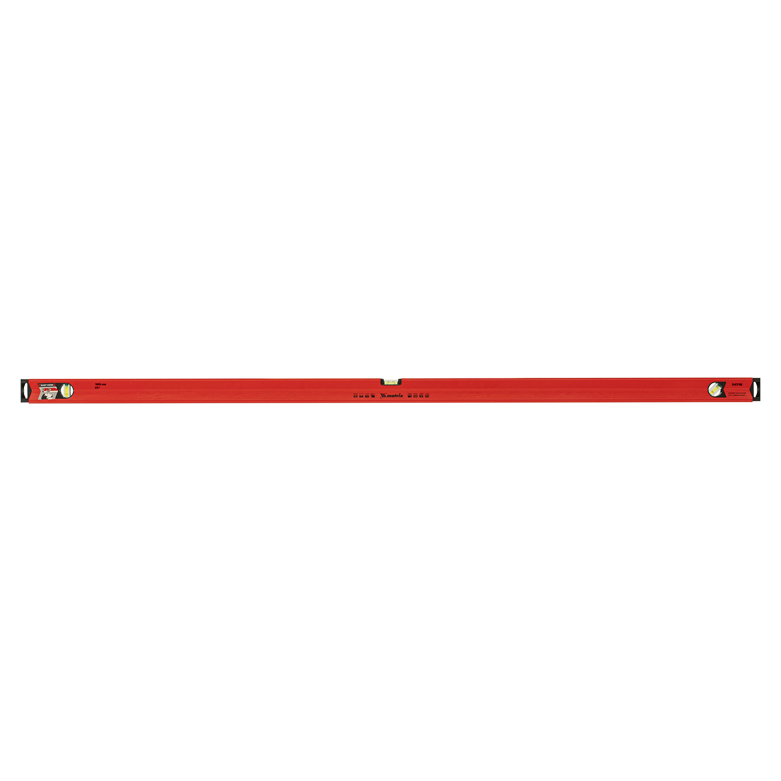 Уровень алюминиевый магнитный Matrix 34718 усиленной конструкции, длиной 1800 мм, с фрезерованной рабочей поверхностью, оснащен 3 глазками и одним зеркальным отражателем. Позволяет выявить отклонения от вертикали, горизонтали и угла 45°. Встроенный зеркальный глазок облегчает считывание показаний.