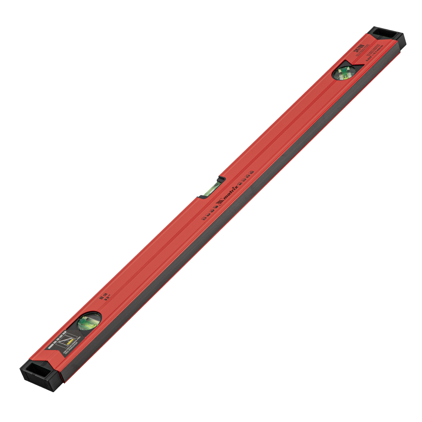 Уровень алюминиевый магнитный Matrix 34708 усиленной конструкции, длиной 800 мм, с фрезерованной рабочей поверхностью, оснащен 3 глазками и одним зеркальным отражателем. Позволяет выявить отклонения от вертикали, горизонтали и угла 45°. Встроенный зеркальный глазок облегчает считывание показаний.