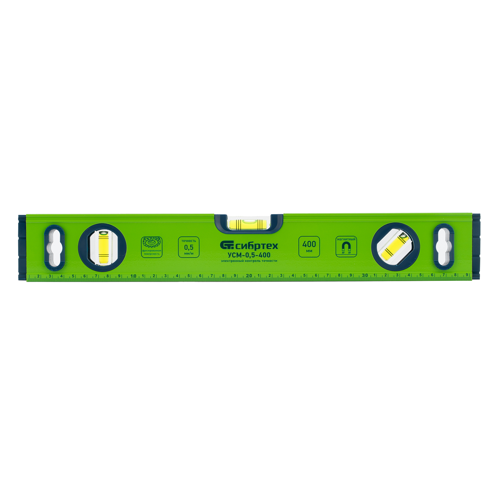 Алюминиевый фрезерованный уровень Сибртех УСМ-0,5-400 34113 длиной 400 мм, магнитный, с 3 глазками, поможет найти отклонения от горизонтальной и вертикальной плоскостей и угла 45 градусов. Инструмент незаменим при осуществлении строительных и ремонтных работ, т.к. обеспечивает высокую точность работы.,Для определения отклонения вертикали 90 градусов необходимо использовать пузырьковую ампулу только в верхнем положении уровня. Только базовая поверхность является рабочей (противоположная ампуле 180 градусов).