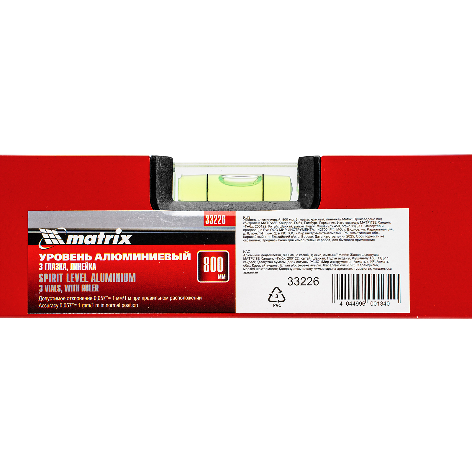 Алюминиевый уровень Matrix 33226 длиной 800 мм, красного цвета, с 3 глазками и линейкой, пригодится при проведении строительных, ремонтных и монтажных работ. С ним повышается точность работы, что позволяет добиться качественного результата. Три колбы рассчитаны на проверку горизонтали, вертикали и угла 45 градусов, погрешность равна 1 мм/м (0,057 градуса).,Для определения отклонения вертикали 90 градусов необходимо использовать пузырьковую ампулу только в верхнем положении уровня. Только базовая поверхность является рабочей (противоположная ампуле 180 градусов).