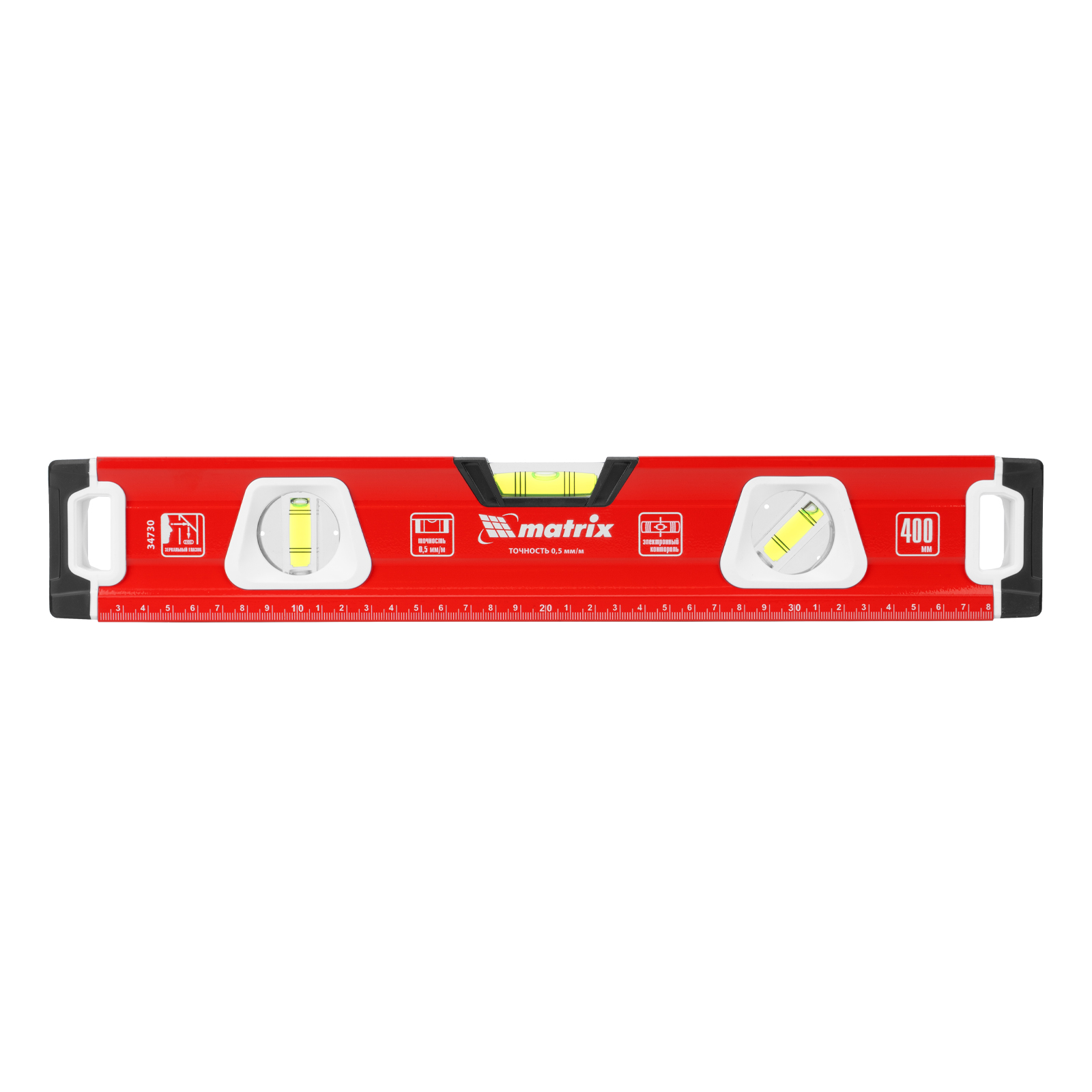 Уровень алюминиевый фрезерованный Matrix 34730 длиной 400 мм используется при монтаже конструкций и материалов. Позволяет обнаружить отклонения от вертикали, горизонтали и угла 45°, что повышает точность строительных и ремонтных работ.