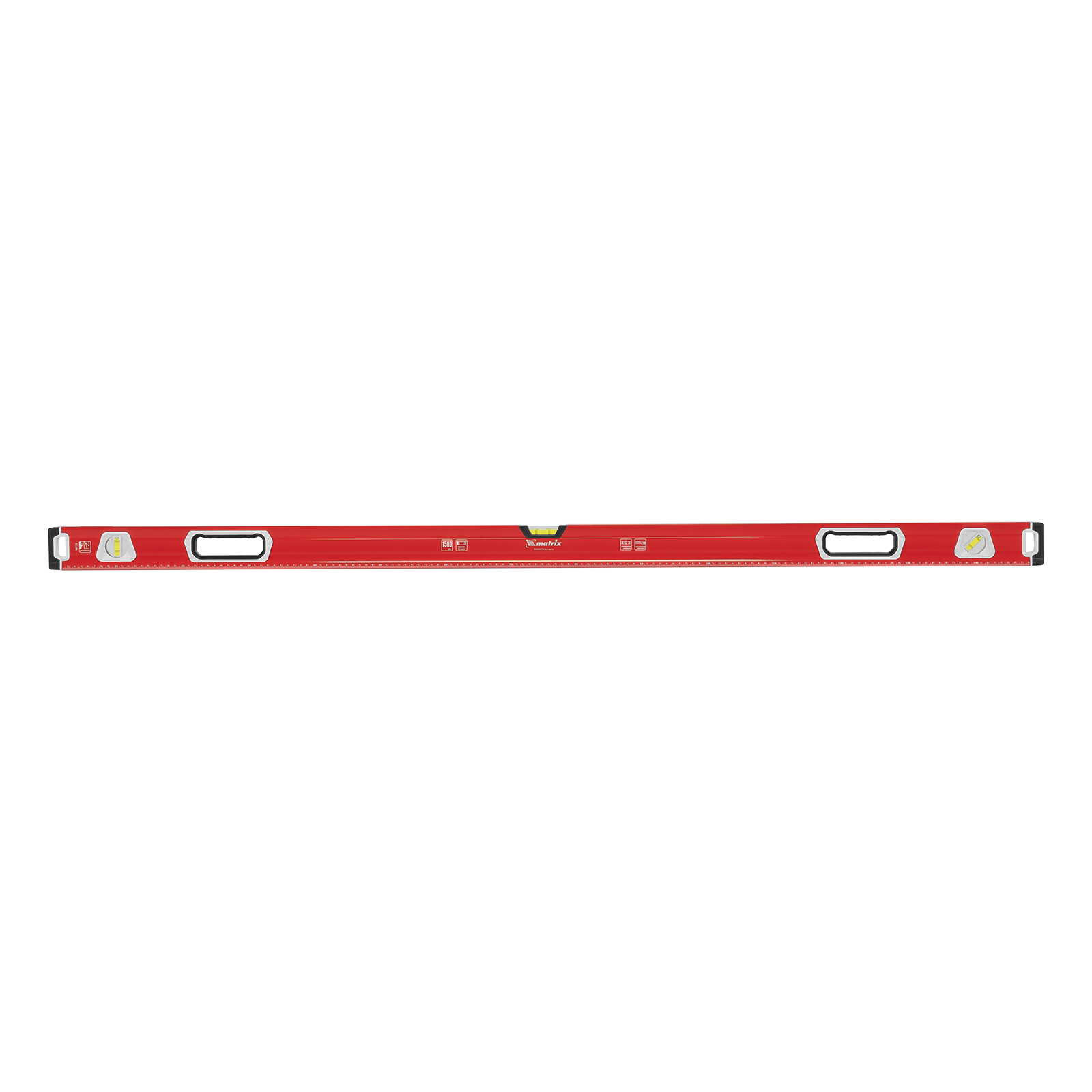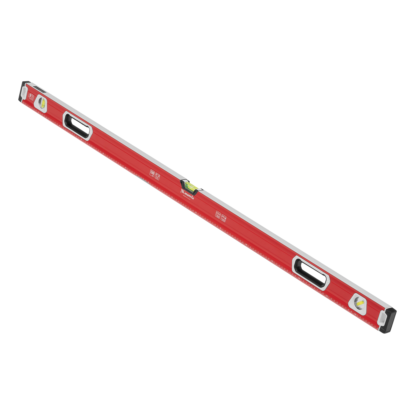 Уровень алюминиевый фрезерованный Matrix 34735 длиной 1500 мм, с магнитной полосой и 2-компонентными рукоятками, 3 глазками и 1 зеркальным отражателем, — измерительный инструмент для контроля отклонений поверхностей от горизонтали, вертикали и угла 45°. Используется для выполнения работ, требующих высокой точности.