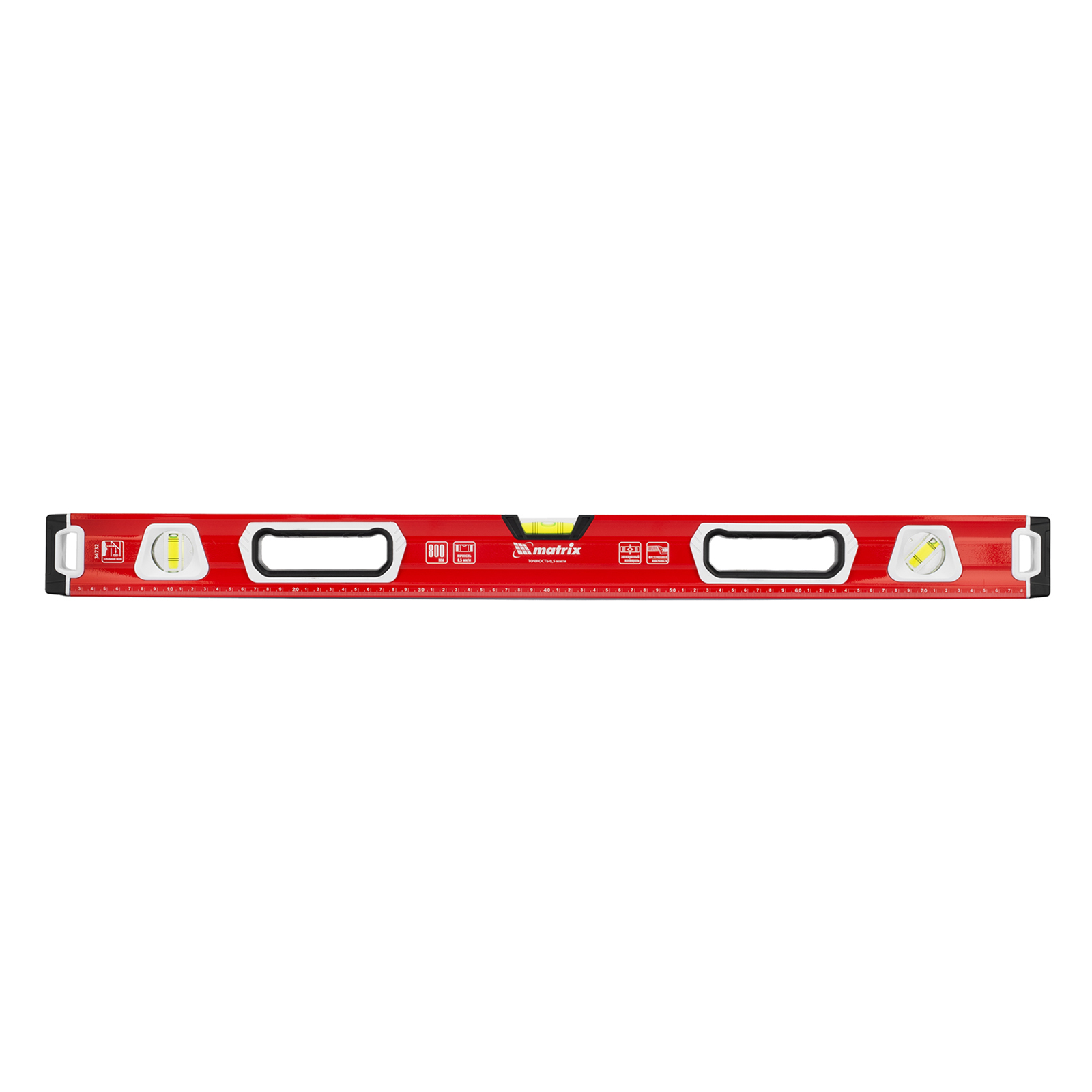 Уровень алюминиевый фрезерованный Matrix 34732 длиной 800 мм, с магнитной полосой и 2-компонентными рукоятками, 3 глазками и 1 зеркальным отражателем, — измерительный инструмент для контроля отклонений поверхностей от горизонтали, вертикали и угла 45°. Используется для выполнения работ, требующих высокой точности.