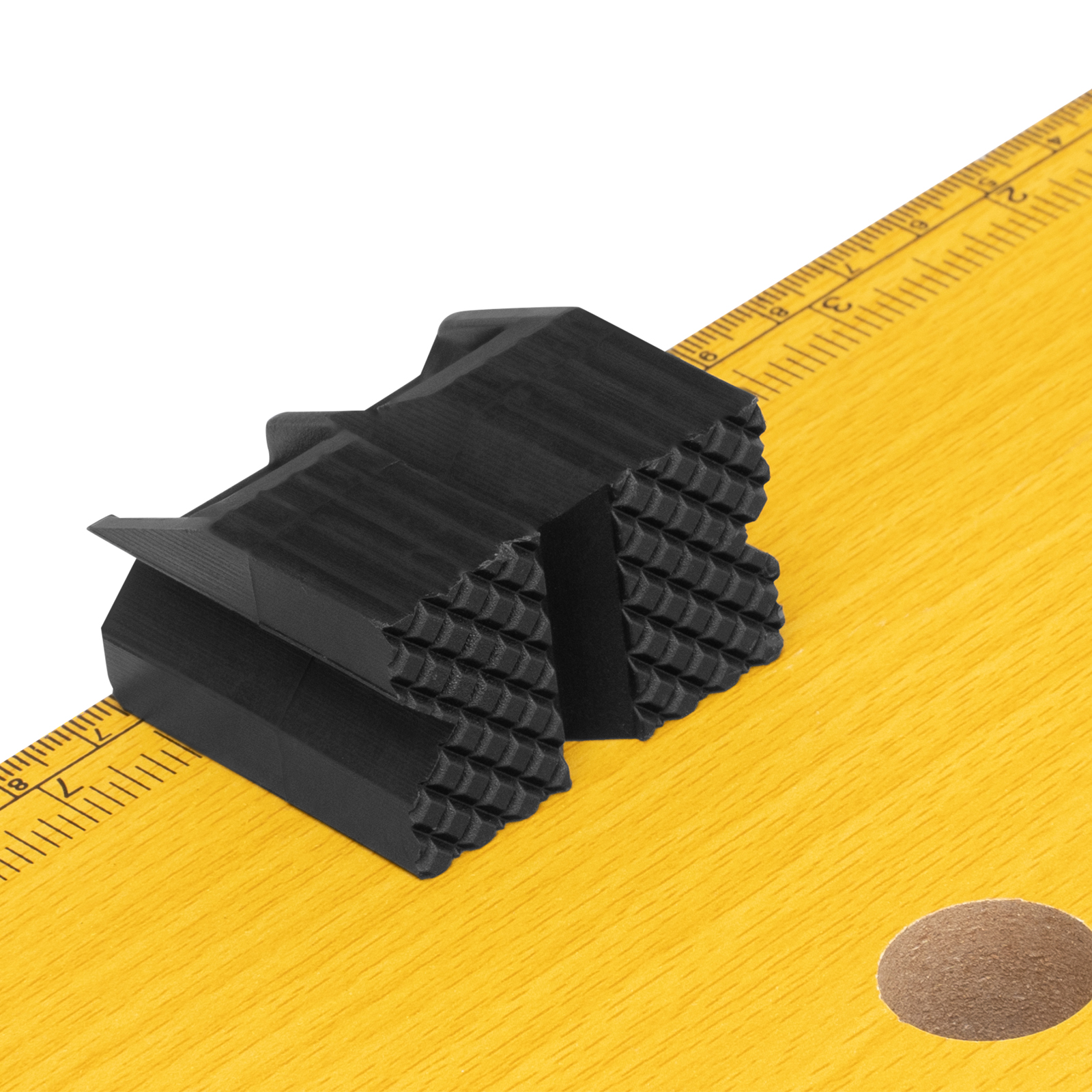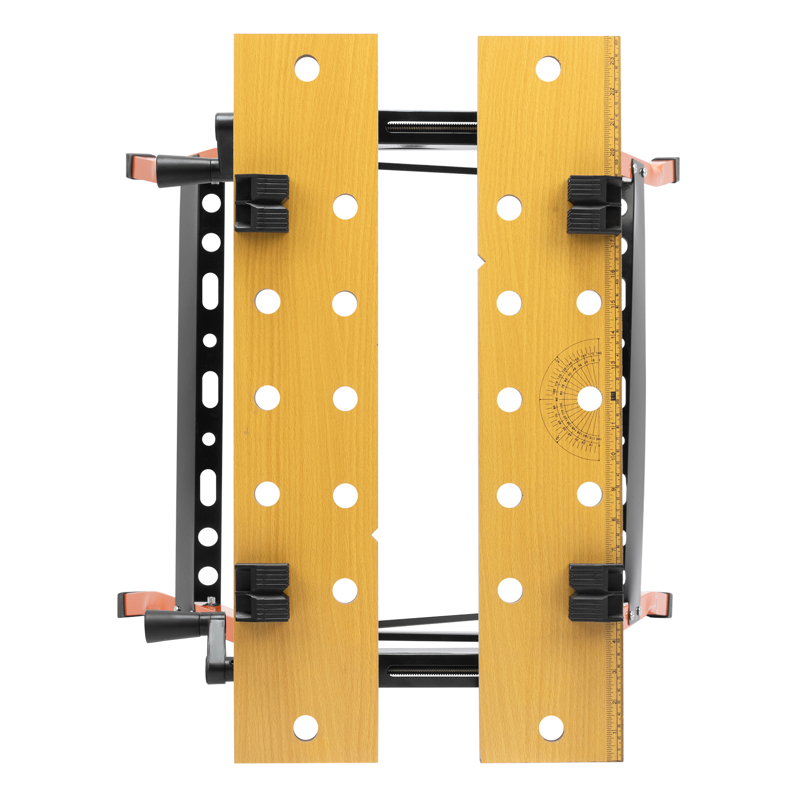 - Удобная эксплуатация — верстак снабжен 4 съемными упорами, которые устанавливаются в различных позициях, а на столешнице имеется разметка с линейкой и транспортиром.
