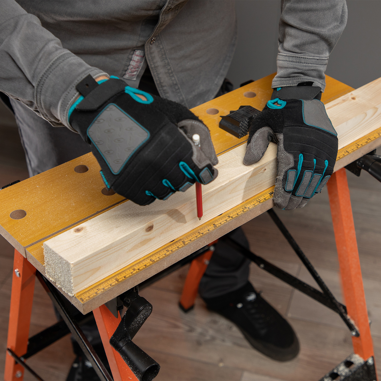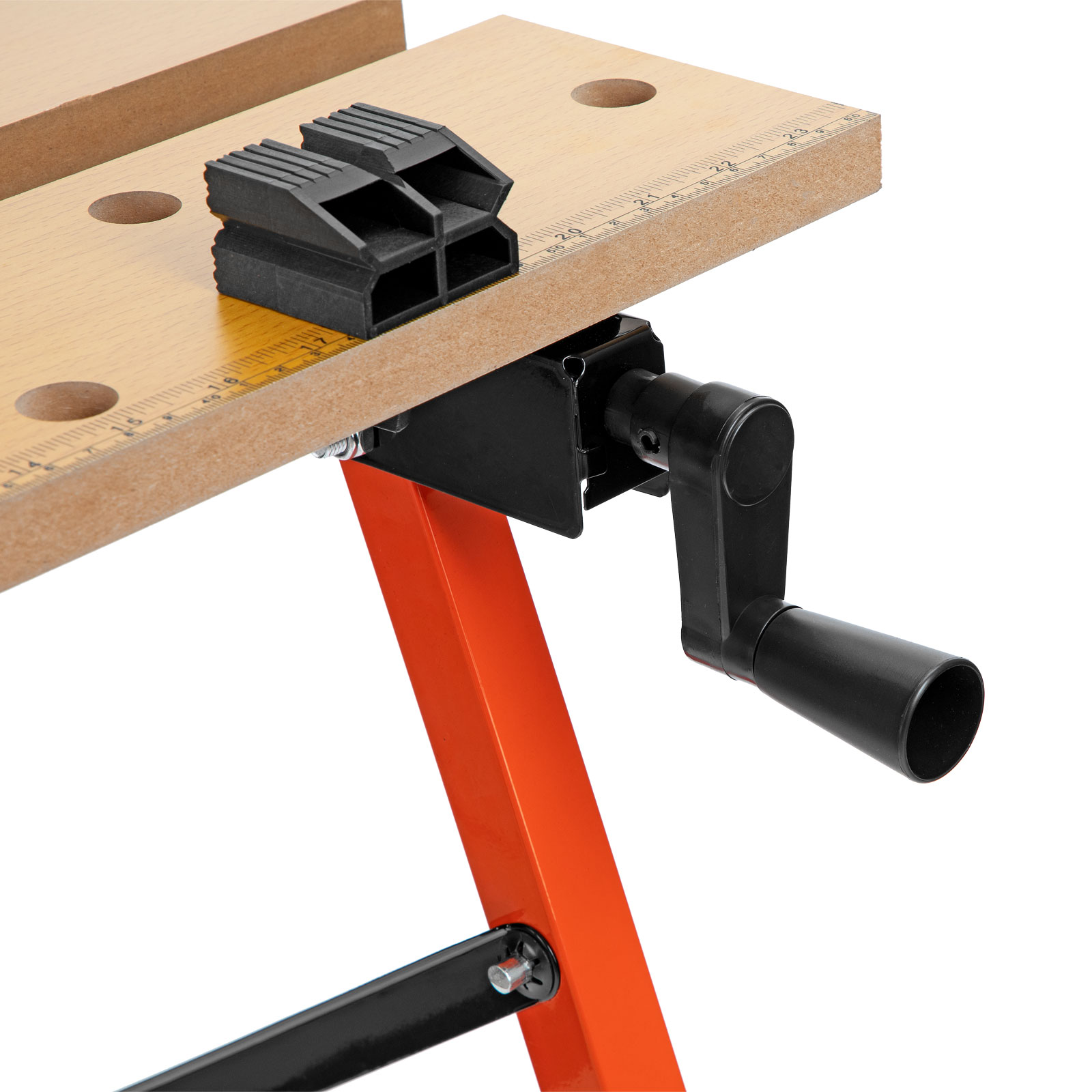 - Удобная эксплуатация — верстак снабжен 4 съемными упорами, которые устанавливаются в различных позициях, а на столешнице имеется разметка с линейкой и транспортиром.