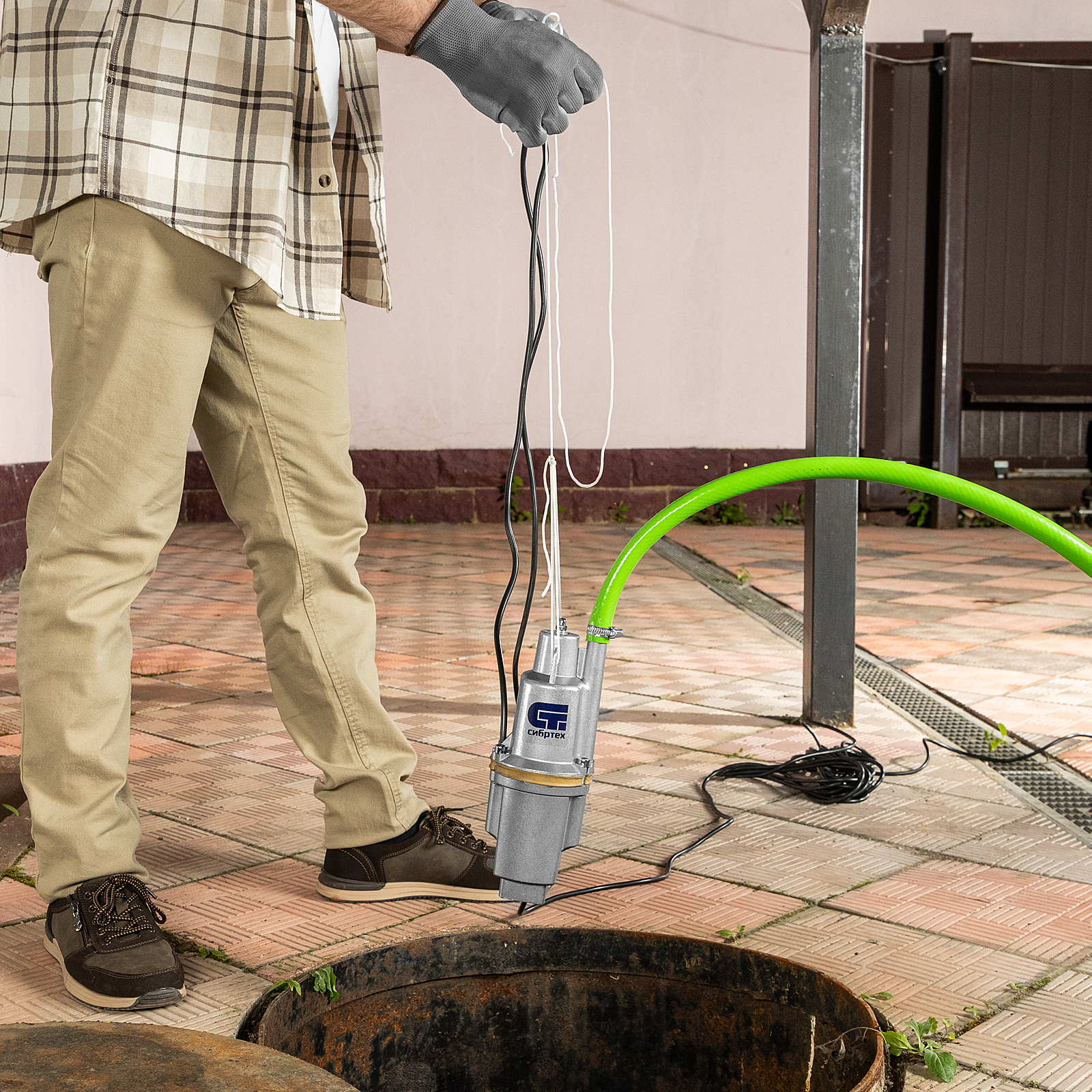 - Готовность к работе — трос для установки насоса и хомут для подключения шланга уже есть в комплекте.