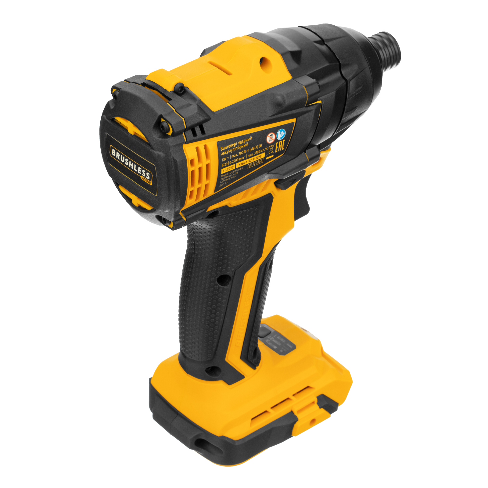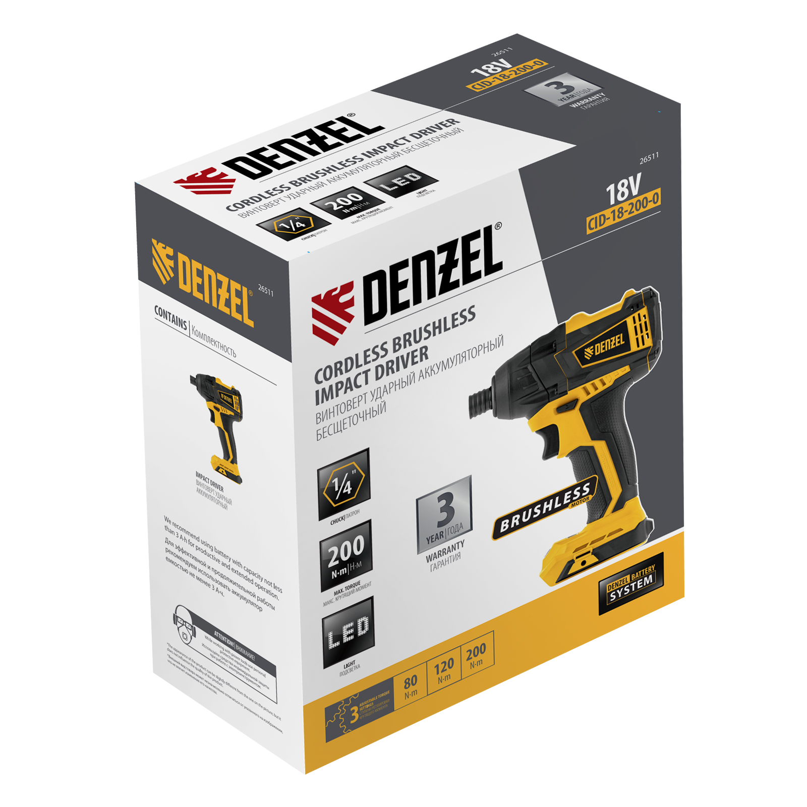 Ударный аккумуляторный винтоверт Denzel CID-IB-200-0 26511 с бесщеточным двигателем работает от аккумулятора Li-Ion с рабочим напряжением 18 В (не входит в комплект поставки) и благодаря высокому крутящему моменту 200 Нм подходит для завинчивания и отвинчивания винтов и шурупов, а также затягивания и откручивания гаек. Эффективен для демонтажа перетянутого и закисшего крепежа, закручивания длинных болтов и шурупов. Пригодится для сборки мебели и различных конструкций.,Аккумуляторный винтоверт не зависит от стационарного источника энергии. Инструмент работает на платформе 18V Denzel battery system и совместим с элементами питания 18 В.